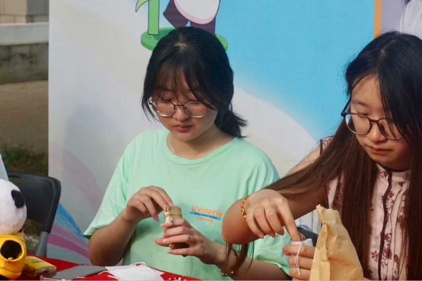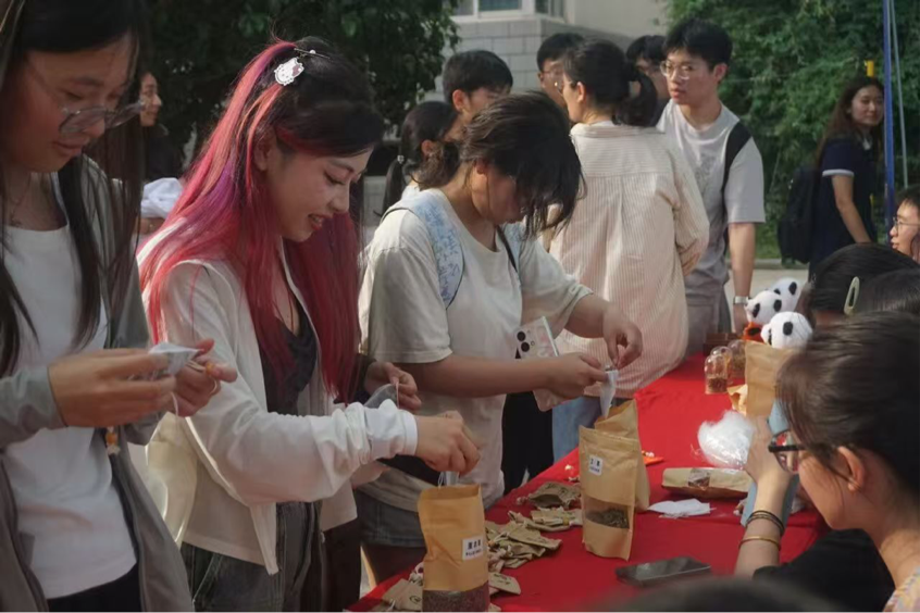 郁金园的中医药主题活动成为现场亮点。其中,“快乐侍卫”系列熊猫玩偶由师生团队原创设计,不仅造型憨态可掬,更将陈皮、藿香等具有芳香醒脾功效的中药材融入填充物,实现传统药香与现代文创的融合,让学子在互动中潜移默化接纳中医药文化;香囊手作区前排起长队,现场提供艾叶、薰衣草、薄荷等十余种道地药材,参与者可根据需求定制驱蚊、安神、醒脑等功效的香囊,在穿针引线间学习传统工艺,传承非遗文化。