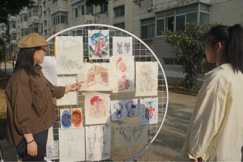 劳动与艺术实践板块同样精彩纷呈。泽兰园劳动教育成果区,外卖纸袋变身栩栩如生的树叶、塑料纸化作娇艳花朵、泡沫与纸板组合成小黄鸭扇子,各类废品改造作品既展现学子奇思妙想,也传递“劳动创造价值、环保源于生活”的理念;书法体验区墨香四溢,学子提笔书写“淡安精神”,在横竖撇捺间领悟文化内涵。郁金园则举办解剖画艺术展,十余幅学生作品以严谨笔触勾勒人体结构,同时融入传统艺术手法呈现经络走向,既破除了解剖学的神秘感,也让医学与美学完美交融,激发学生专业学习兴趣。