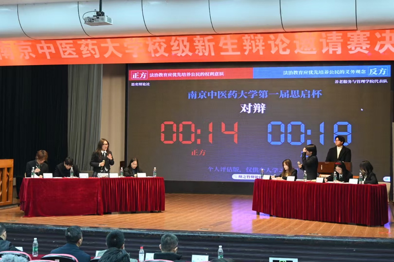 本届赛事自启动以来,吸引了全校各院系新生踊跃参与。经过数周的激烈角逐,思弈辩论社代表队与养老服务与管理学院代表队脱颖而出,成功会师决赛。双方围绕“法治教育应优先培养公民的权利意识/法治教育应更强调公民的义务观念”这一兼具时代内涵与思辨价值的辩题,展开了一场思想交锋与语言艺术的盛宴。
